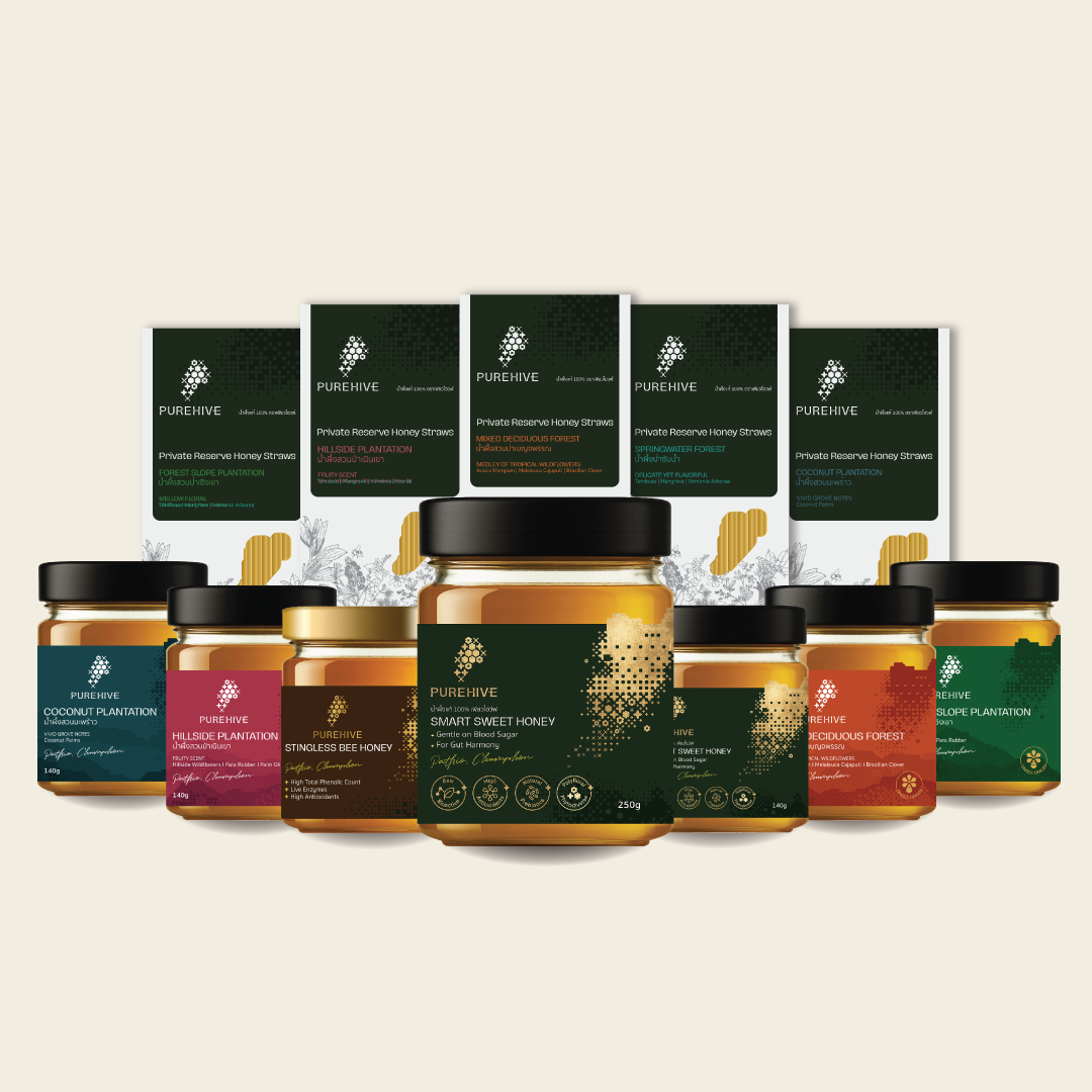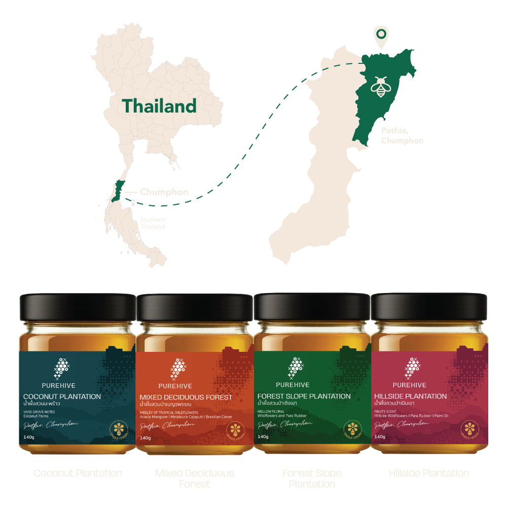 From the single origin forests of Pathio, Chumphon, PureHive gathers honey of rare distinction. Each hive reflects its biodiverse surroundings and the relationships of all living organisms. Indeed, every drop a living spectrum of flavors shaped by the forest; every jar holding the memory of its woodland home.